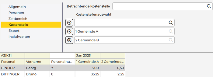 In der Gruppe "Kostenstelle" kann auch auf eine oder auch mehrere Kostenstelle eingeschränkt werden, sodass nur die Leistungsstunden auf diesen Kostenstellen ausgewertet werden: