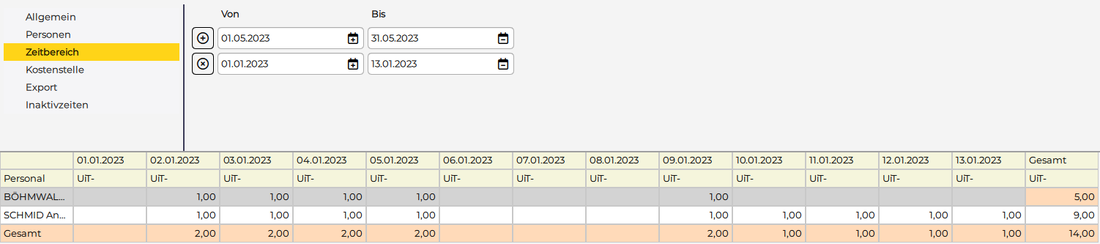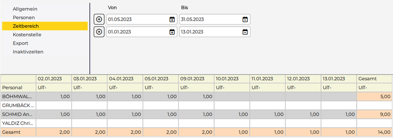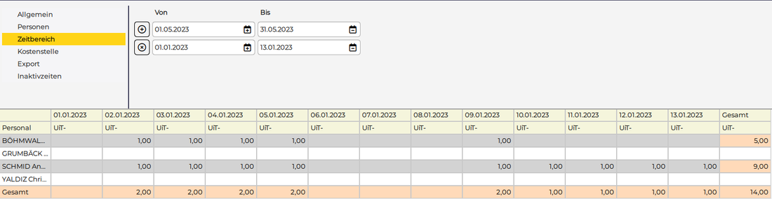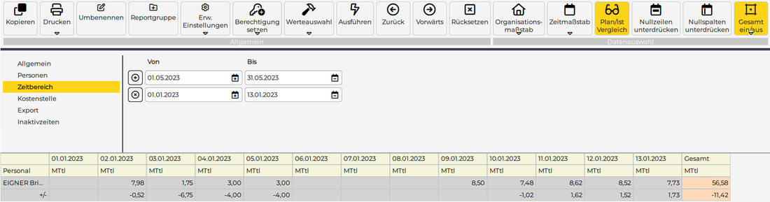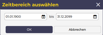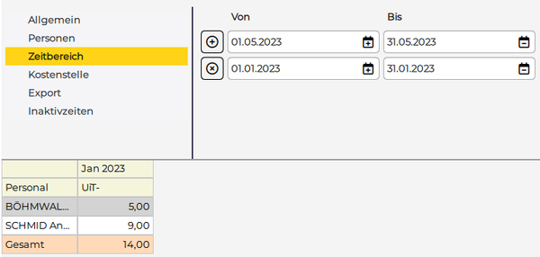 Unter der Kartei „Zeitbereich“ wird der auszuwertende Zeitraum festgelegt. Standardmäßig handelt es sich dabei um den aktuellen Monat.