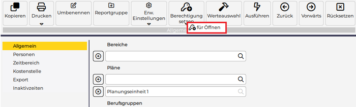 Unter der Gruppe„Allgemein“ werden die Bereiche, Planungseinheiten und Berufsgruppen festgelegt.