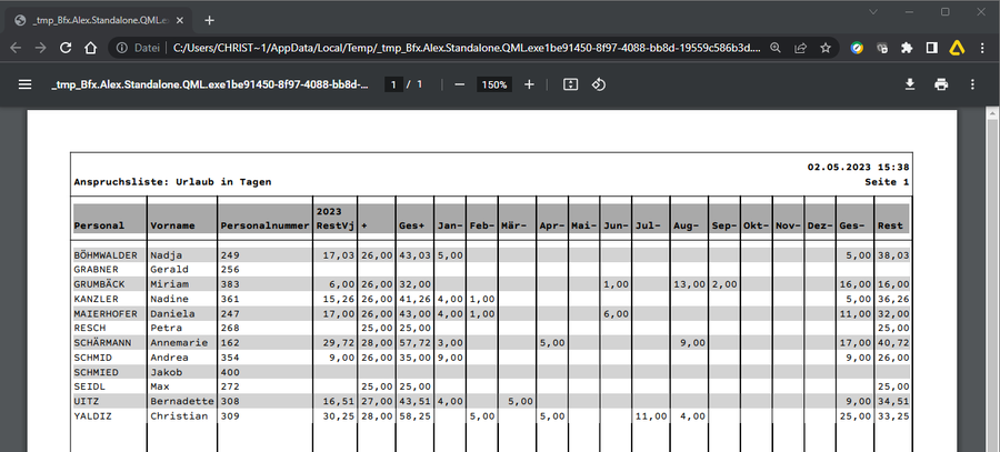 Beispiel: Standard-Report Anspruchsliste für Urlaubskonten