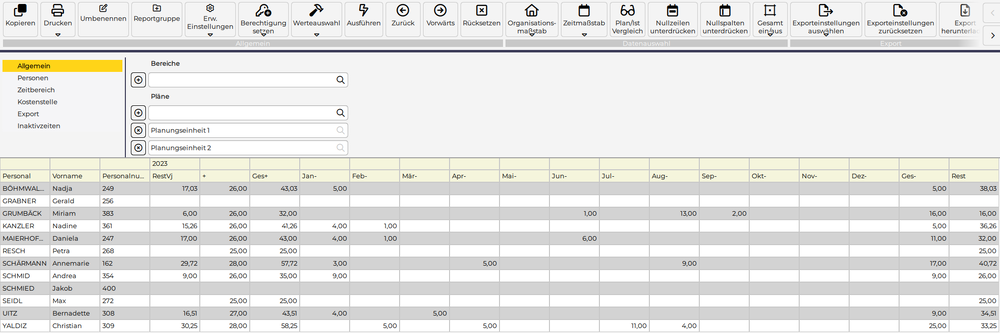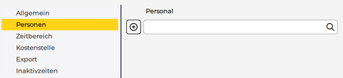 Mithilfe der Auswahl „Personen“ besteht die Möglichkeit der Einzelauswertung für einen oder mehrere Mitarbeiter. Diese müssen nicht auf der gleichen Planungseinheit beschäftigt sein. Eine zusätzliche Auswahl von Planungseinheiten oder Bereichen ist unter "Allgemein" möglich.