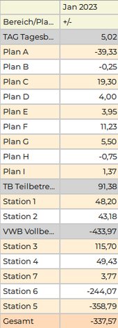 Entsprechend der Auswahl passen sich die Summen der Auswertung an. Es kann beispielsweise eine Zwischensumme pro Bereich ausgewertet werden: