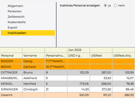Die Werte der inaktiven Mitarbeiter werden ebenfalls in den Gesamtsummen mitberechnet.