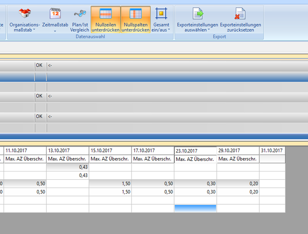 Ab der Version 2018.02 können neben den "NullZEILEN" auch "NullSPALTEN" unterdrückt werden: Hier werden nur die Tage (Spalten) angezeigt, an denen auch ein Wert vorhanden ist: