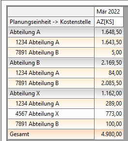 Pro Abteilung wird dargestellt, wie viele Stunden der stammzugeteilten Mitarbeiter auf anderen Kostenstellen geleistet wurden:
