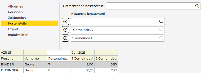 In der Gruppe "Kostenstelle" kann auch auf eine oder auch mehrere Kostenstelle eingeschränkt werden, sodass nur die Leistungsstunden auf diesen Kostenstellen ausgewertet werden:
