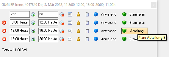 3 Stunden während des Dienstes wurden auf Abteilung B geleistet und nicht am Stammplan (Abteilung A)