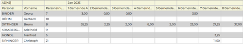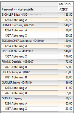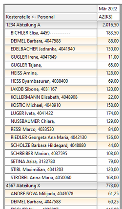 Unterhalb der Kostenstelle werden die Leistungsstunden pro Mitarbeiter gesplittet dargestellt.