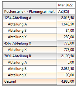 Wird diese Option ausgewählt, so werden pro Organisationsmaßstab die Kostenstellenstunden dargestellt: