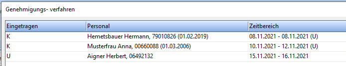 - "Eingetragen": Im oberen Bereich werden die eingetragenen Krankenstände angezeigt; diese wurden noch nicht weiter bearbeitet.