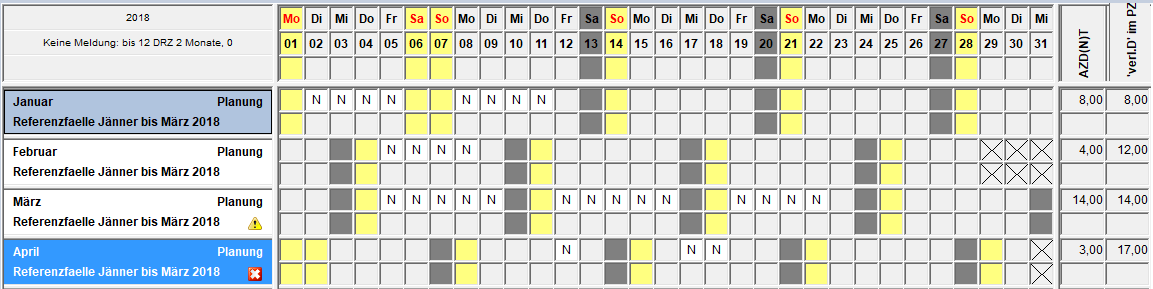 Im März ist die Anzahl der Nachtdienste für die Prüfung der Warnung erreicht, deshalb erscheint auch die Warnung (es erfolgt keine Vorausschau in den April).
