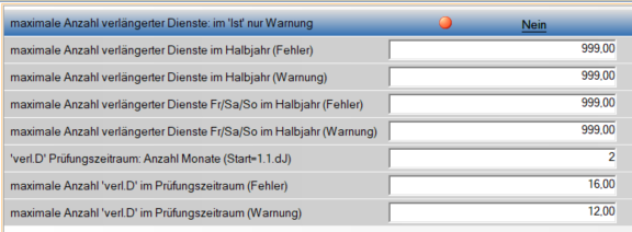 Hier kann festgelegt werden, wieviele verlängerte Dienste pro Monat geplant werden dürfen. Als verlängerter Dienst zählen alle Tage über 13 Stunden, abhängig vom Total für AZG-Prüfung.
