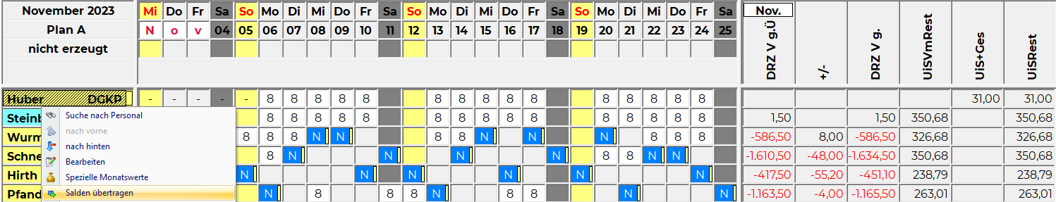 • Im Dienstplan: im ersten Monat nach der Karenz: Rechtsklick auf den Mitarbeiternamen - Salden übertragen