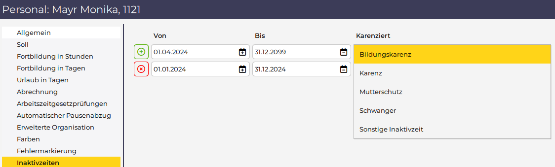 Inaktivzeiten sind eine Programmfunktion zum Verwalten von längeren Zeiträumen wie z. B. Karenzzeiten.