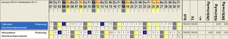 Der Abbau der Nachtschwerarbeitsstunden erfolgt durch Eintragen eines Planungscodes, dieser wird häufig ZAN, ZN oder NS genannt (Zeitausgleich Nachtschwerarbeit).