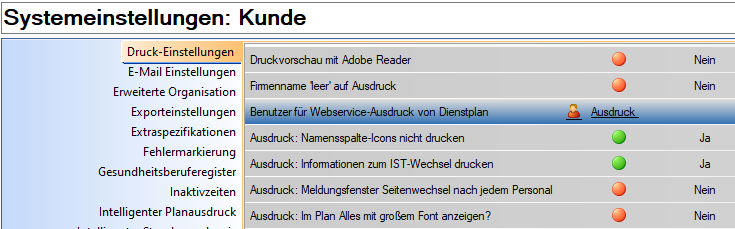 In den Systemeinstellungen im Reiter Druck-Einstellungen muss beim Parameter "Benutzer für Webservice-Ausdruck von Dienstplan" ein Benutzer hinterlegt werden, damit die Funktion zur Verfügung steht.