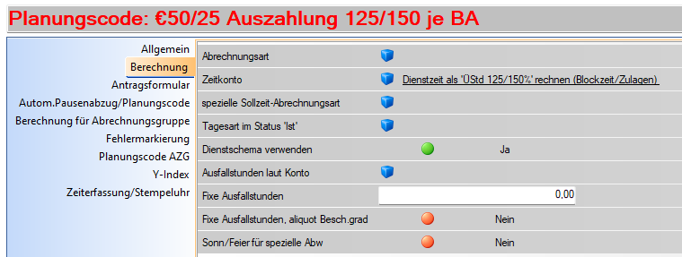Sollen Überstunden am Tag bei Vollzeit fix mit 50% Zuschlag und bei Teilzeit fix mit 25% Zuschlag ausgezahlt werden, so muss der Planungscode folgendermaßen angelegt werden: