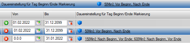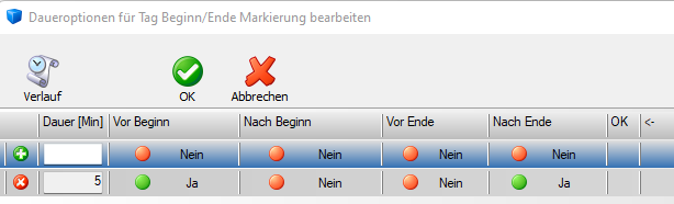Zur Personalisierung der Dauer kann beim Parameter "Dauereinstellung für Tag Beginn/Ende Markierung" die notwendige Einstellung gemacht werden: