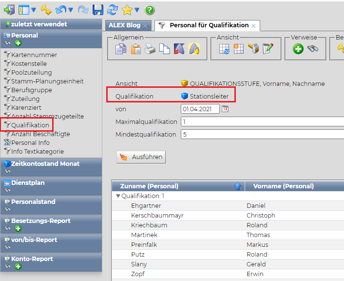 Bsp. Mitarbeiter mit der Qualifikation "Stationsleiter" und dem zugehörigen Dienst