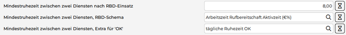 Anzahl der Stunden, welche zwischen 2 Diensten mindestens durchgehend frei sein muss, wenn das beim Parameter "Mindestruhezeit zwischen zwei Diensten, RBD Schema" berechnet wird.