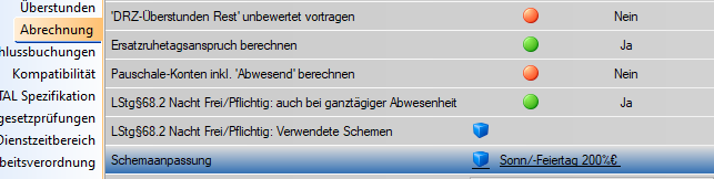 Im behandelten Beispiel werden die Schemen "Anwesend Mehrarbeit" sowie "Anwesend Winterdienst" später für alle Stunden am Sonn- und Feiertag durch "Zeit auszahlen" ersetzt und für alle Stunden in der Nacht durch "Zeit gutschreiben"