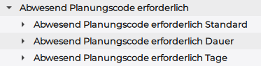 Diese Verdichtungsebene besteht aus dem Standard-Abrechnungsschema "Abwesend Planungscode erforderlich Standard". Strukur "Abwesend Planungscode erforderlich" Es gibt aktuell keinen Anwendungsfall für dieses Abrechnungsschema.