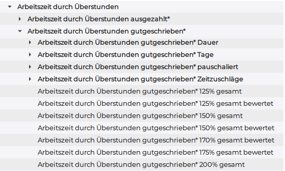 Die Verdichtungsebene "Arbeitszeit durch Überstunden*" enthält die Summe aller ausgezahlten und gutgeschriebenen Überstunden.