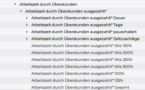 Weiters sind auf der Ebene "Arbeitszeit durch Überstunden ausgezahlt*" bereits direkt verdichtete Auszahlungskonten für alle untergeordneten Gruppen sichtbar: