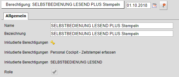 Wenn die Benutzer im Personal Cockpit auch stempeln dürfen, müssen neue Rollen angelegt werden, welche das Recht Personal Cockpit - Zeitstempel erfassen enthalten:
