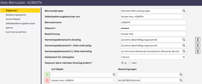 Wird die definierte Berechtigung am System geändert, so hat dies keine Auswirkung auf bestehende Selbstbedienungsbenutzer. Nur bei neuem Personal wird dann je nach gewählter Berechtigung ein Selbstbedienungsbenutzer mit der entsprechenden Rolle angelegt.