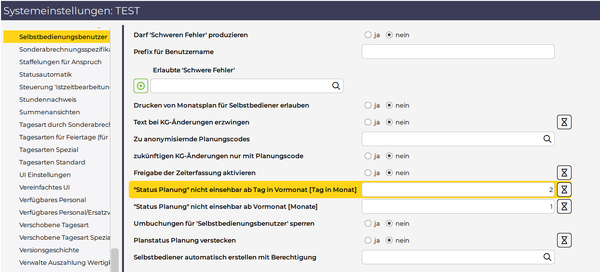 - "Status Planung" nicht einsehbar ab Tag in Vormonat [Tag in Monat] : Definiert den Tag, ab dem der Status Planung ausgeblendet wird