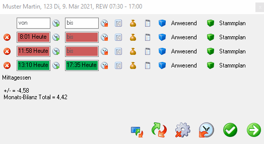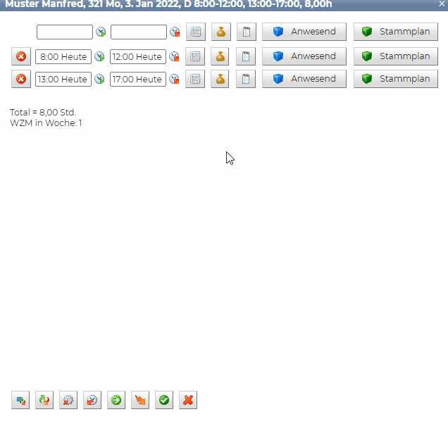 Sie können für Änderungen die nebenstehenden Uhrsymbole ( Uhrensymbole.png ) verwenden, um die genaue Uhrzeit auszuwählen. Jede Korrektur wird mit einem Klick auf "Ausführen" () bestätigt.