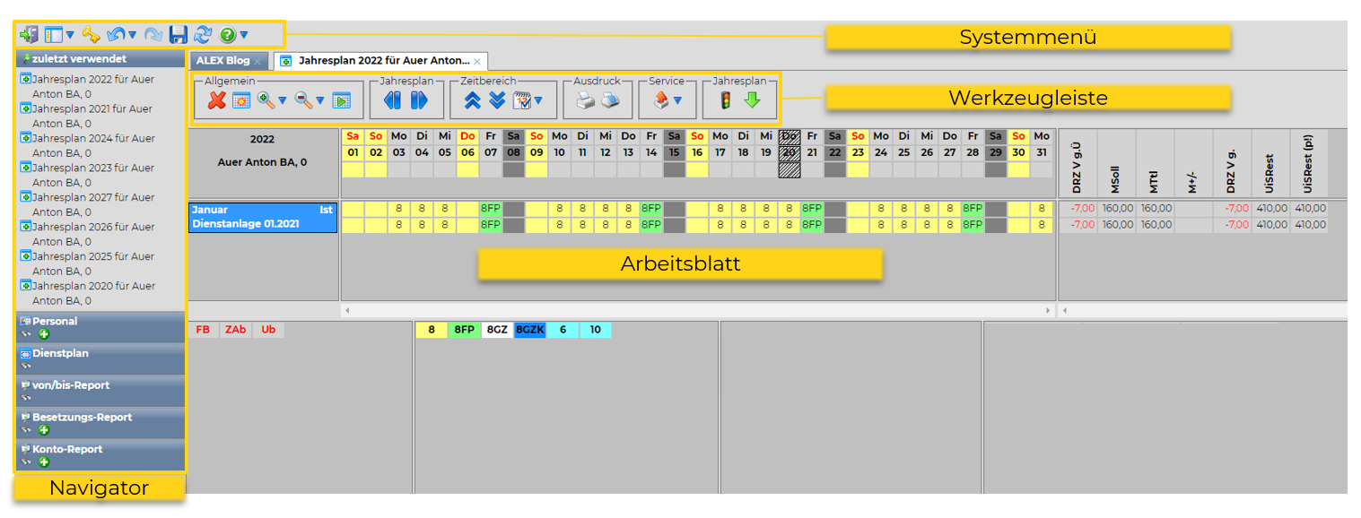 Mit Hilfe des Navigators können die verschiedenen Navigatorpunkte angesprochen werden. Nach dem Öffnen von Alex® ist der Navigator immer sichtbar, man könnte ihn allerdings auch ausblenden.