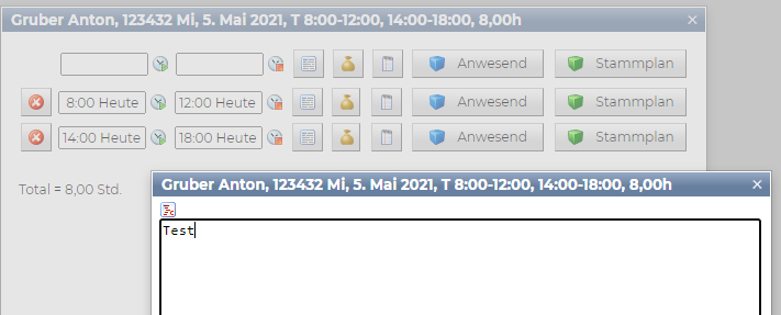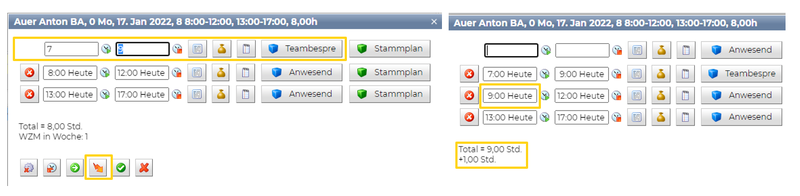 • ganztägig aber mit geänderter Uhrzeit: ebenfalls im Kommt-Geht-Fenster den Planungscode mit Uhrzeiten eintragen