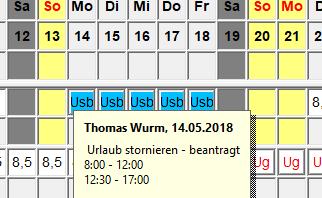 Wird dieser Zeitbereich ausgewählt, so wird im Dienstplan statt dem "genehmigt"-Planungscode der "stornieren beantragt"-Planungscode eingetragen: