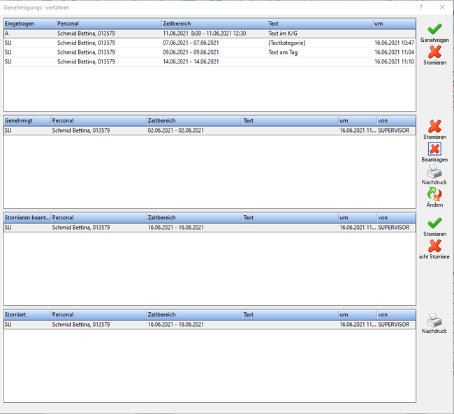 In diesem Fenster kann der Genehmiger die Anträge genehmigen oder stornieren.