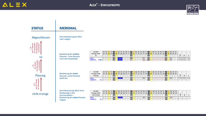 Beim Statuswechsel wird die Konsistenz der Statustreppe von Alex® gewährleistet, dadurch kann diese Funktion einen längeren Zeitraum betreffen.