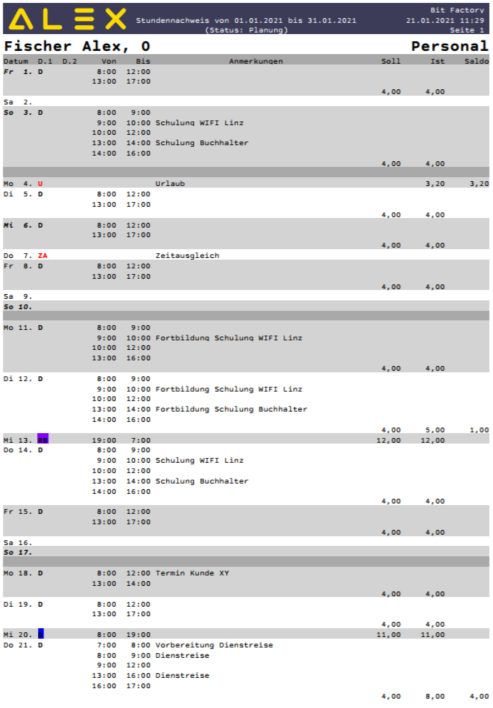 - Stundennachweise für ein ganzes Jahr bzw. über mehrere Monate drucken