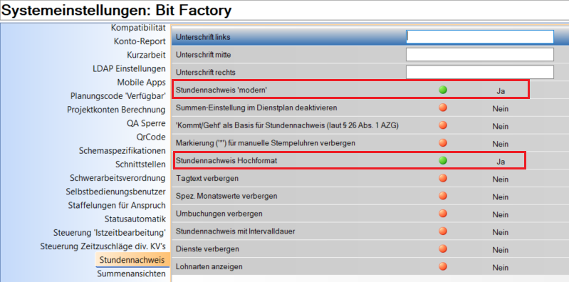 Systemeinstellungen für Stundennachweis `modern`