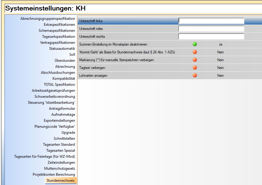 Hinterlegt werden können die Felder für die Unterschrift auf Bereich und auf System (Reiter Stundennachweis).
