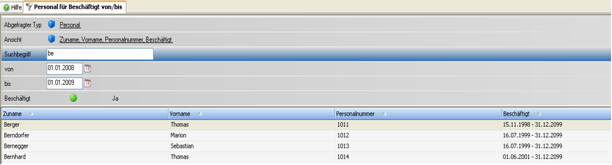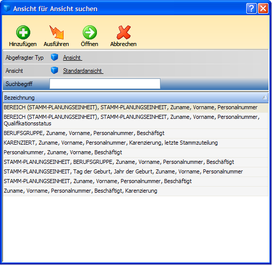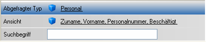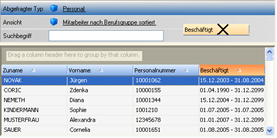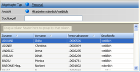 Am Beispiel Personalstamm ist standardmäßig die Ansicht „Zuname, Vorname, Personalnummer, Beschäftigt“ voreingestellt.