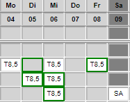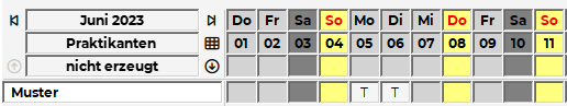 Unterhalb der Monatsbezeichnung ist die zum Monatsersten gültige Stammplanungseinheit ersichtlich. Rechts daneben befindet sich der aktuelle Bearbeitungsstatus.