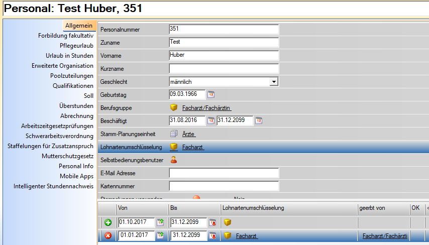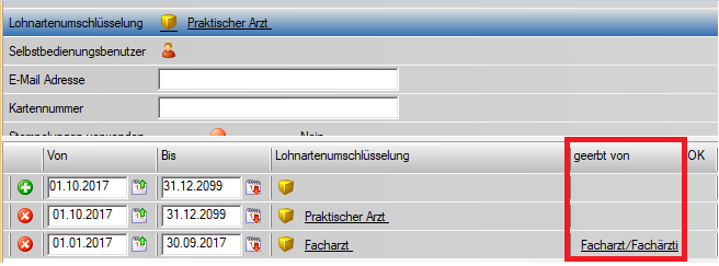 Wie im Bild ersichtlich, wird die Lohnartenumschlüsselung "Facharzt" geerbt von "Facharzt/Fachärzte" = Berufsgruppe.