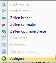Es ist dafür die Funktion „Anlegen“ zu wählen, die mit Einsatz der rechten Maustaste in den einzelnen Feldern erscheint.