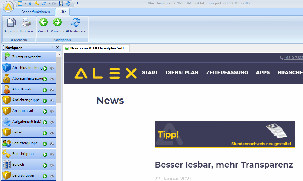 Hinweis: Es werden alle Pläne bzw. Menüpunkte (z.B. Benutzer, Protokolle, Info Lohnarten,...) exportiert, die in der aktuellen Alex®-Sitzung geöffnet wurden.