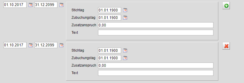 Die Zeile mit dem grünen Plus, ist eine Vorlagenzeile. Mit dieser Zeile, kann eine neue Urlaubszeile angelegt werden. (zb. Erhöhter Anspruch, Wiedereintritt, etc.)