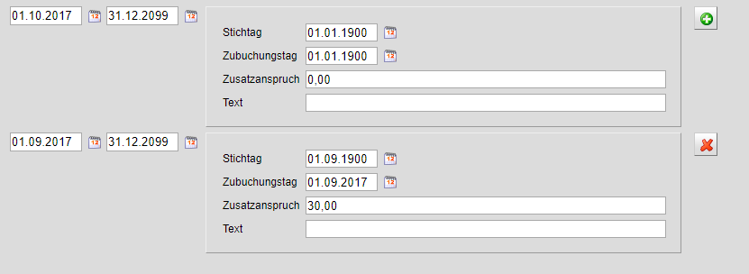 • der Zubuchungstag (= 01.01.1900 – Urlaub wird mit Kalender zugebucht) oder der Zubuchungstag (= Eintrittsdatum - der Urlaub wird mit Eintrittsdatum zugebucht)