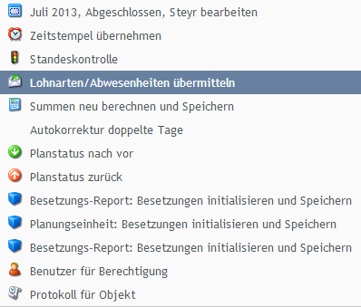 Durch Klick auf den Punkt "Lohnarten/Abwesenheiten übermitteln" (in der Abb. grau hinterlegt) können die Lohnarten übergeleitet werden. Es werden jene Planungseinheiten übermittelt, die ausgewählt wurden. Mittels gedrückt halten der STRG-Taste auf der Tastatur können mehrere Planungseinheiten ausgewählt werden.