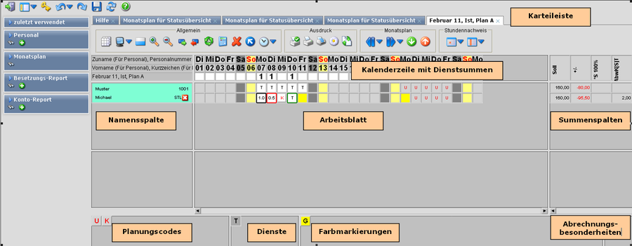 Unterhalb der Monatsbezeichnung ist die zum Monatsersten gültige Stammplanungseinheit ersichtlich. Rechts daneben befindet sich der aktuelle Bearbeitungsstatus.