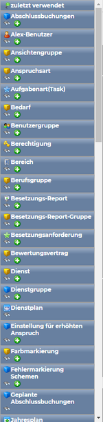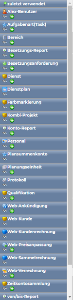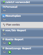 Der Navigator ist ständig am linken Bildschirmrand angezeigt. Abhängig von der eingestellten Ansicht sind die verschiedenen Navigatorpunkte (Zuletzt verwendet, Personal, Monatsplan, ...) sichtbar. Der Navigator kann jederzeit durch Klick auf das Navigator-Symbol im Systemmenü ausgeblendet werden.